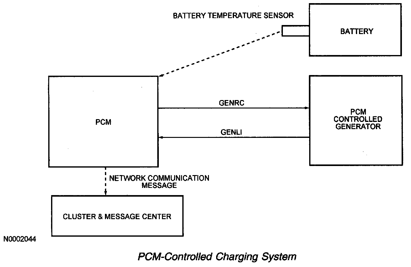 The PCM-controlled charging system provides many additional benefits over the current integral generator regulator system. The first benefit is improved battery life. In an integral generator regulator system, the regulator set point is established by a temperature sensor in the regulator which estimates battery temperature. In a PCM-controlled charging system, the regulator voltage set point is determined by the PCM and communicated to the regulator through the generator regulator control (GENRC) circuit. The PCM uses an algorithm to estimate battery temperature. Improving battery temperature estimates reduces battery damage caused by over- and undercharging.