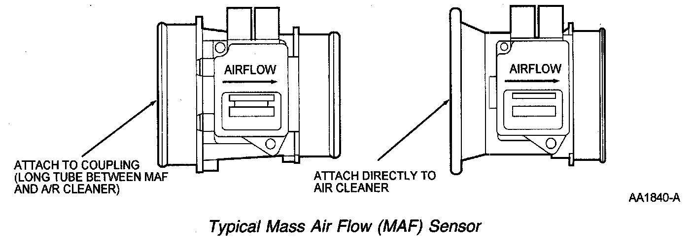 The MAF sensor is located between the air cleaner and the throttle body or inside the air cleaner assembly. Most MAF sensors have integrated bypass technology with an integrated intake air temperature (IAT) sensor. The hot wire electronic sensing element must be replaced as an assembly. Replacing only the element may change the air flow calibration.
