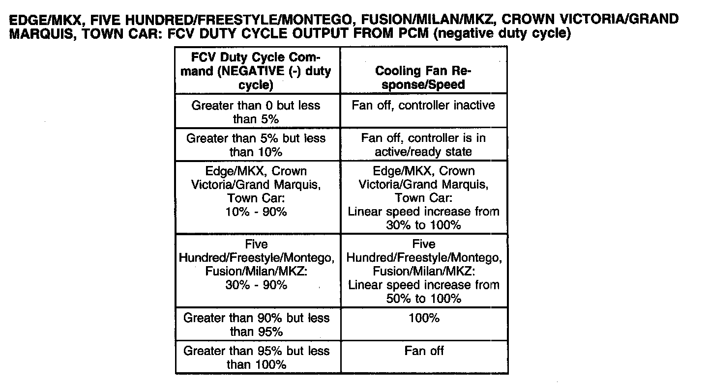 Edge/MKX, Five Hundred/Freestyle/Montego, Fusion/Milan/MKZ, Crown Victoria/Grand Marquis, Town Car: FCV Duty Cycle Output From PCM (Negative Duty Cycle):