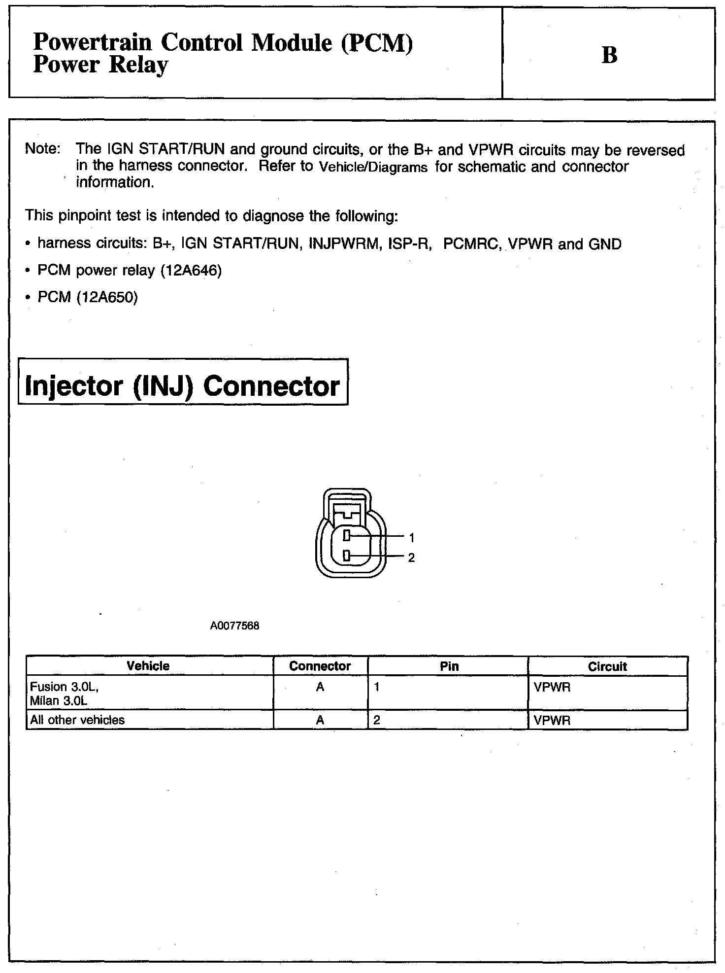 PINPOINT TEST B: POWERTRAIN CONTROL MODULE (PCM) POWER RELAYNote And Injector (INJ) Connector: