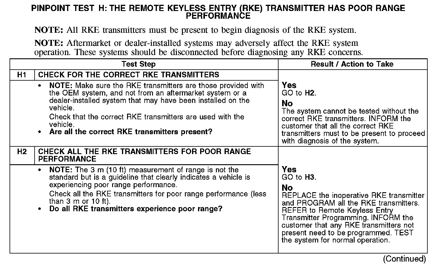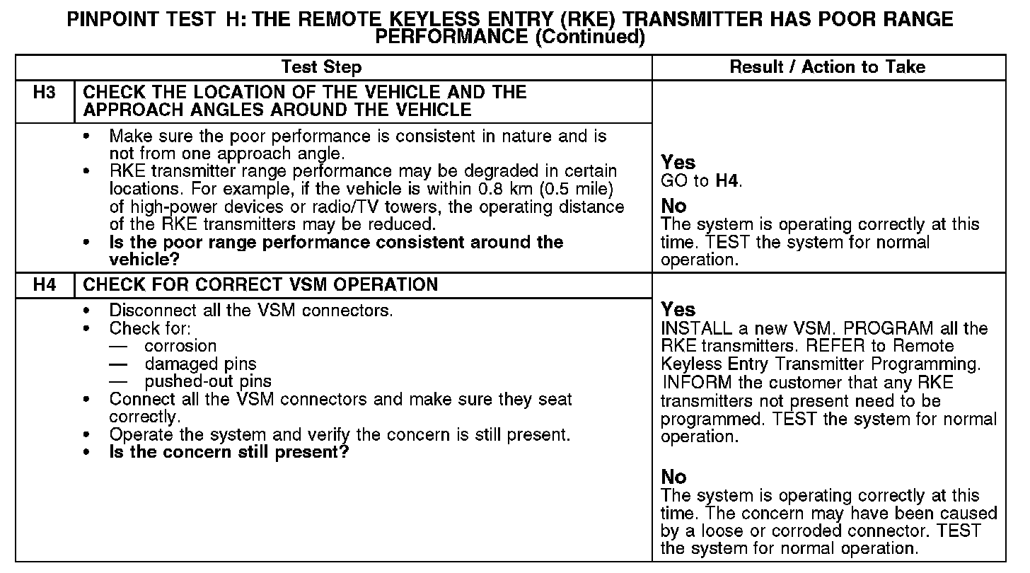 Home >> Ford >> 2007 >> E 450 V8-6.0L DSL Turbo >> Repair and Diagnosis >> Body and Frame >> Locks >> Power Locks >> Testing and Inspection >> Pinpoint Tests >> Locks, Latches and Entry Systems - Module Controlled >> Test H: The Remote Keyless Entry(RKE) Transmitter Has Poor Range Performance