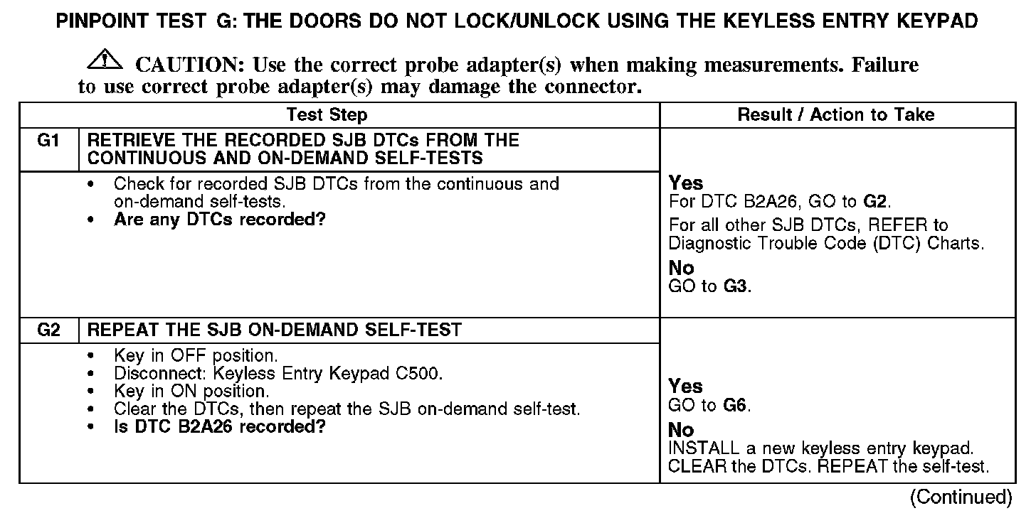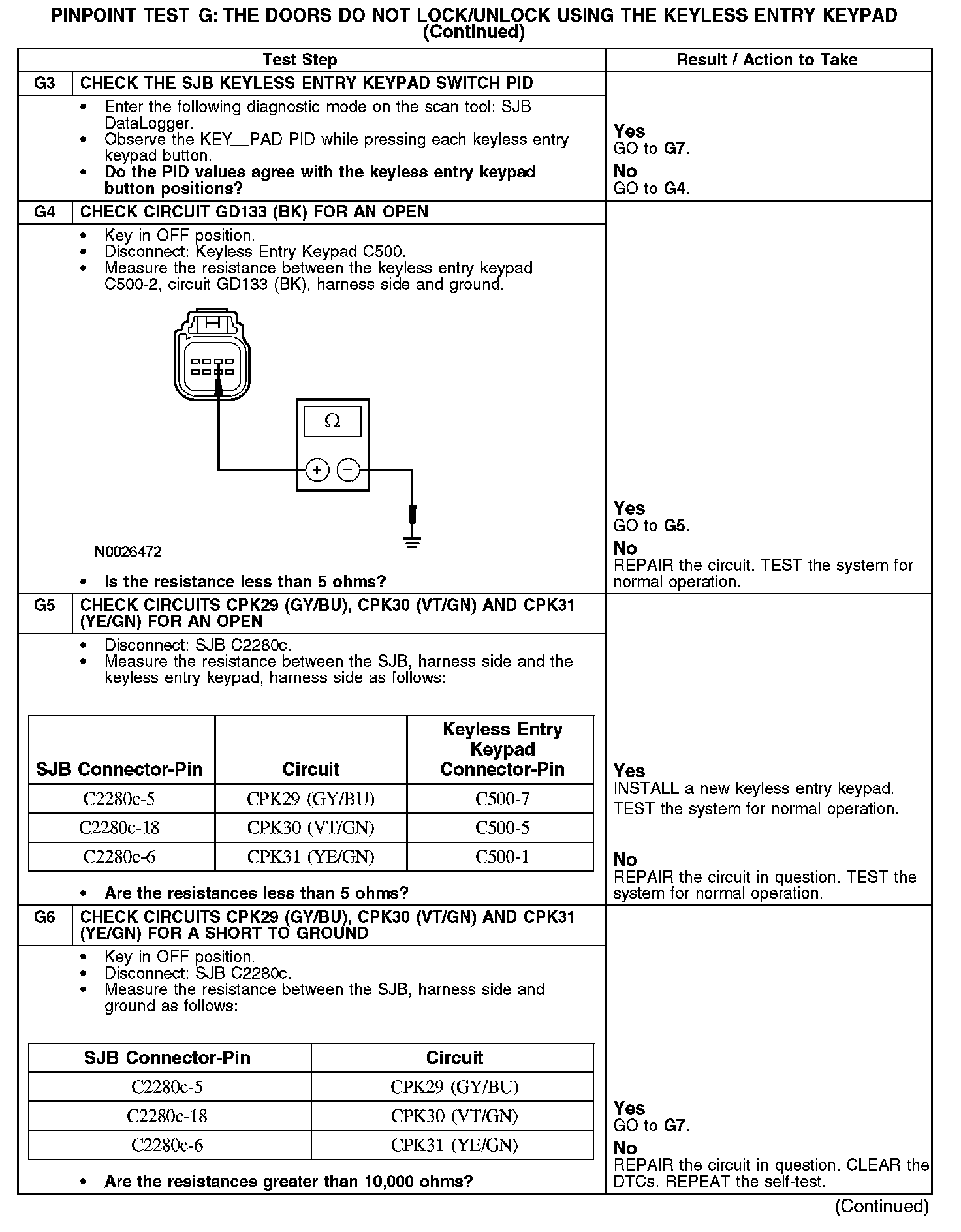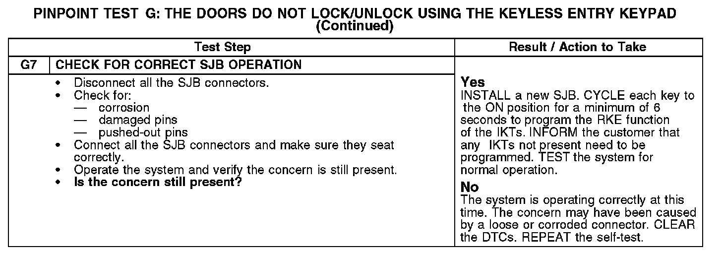 Home >> Ford >> 2007 >> Edge AWD V6-3.5L >> Repair and Diagnosis >> Body and Frame >> Locks >> Power Locks >> Testing and Inspection >> Pinpoint Tests >> Test G: The Doors Do Not Lock/Unlock Using The Keyless Entry Keypad