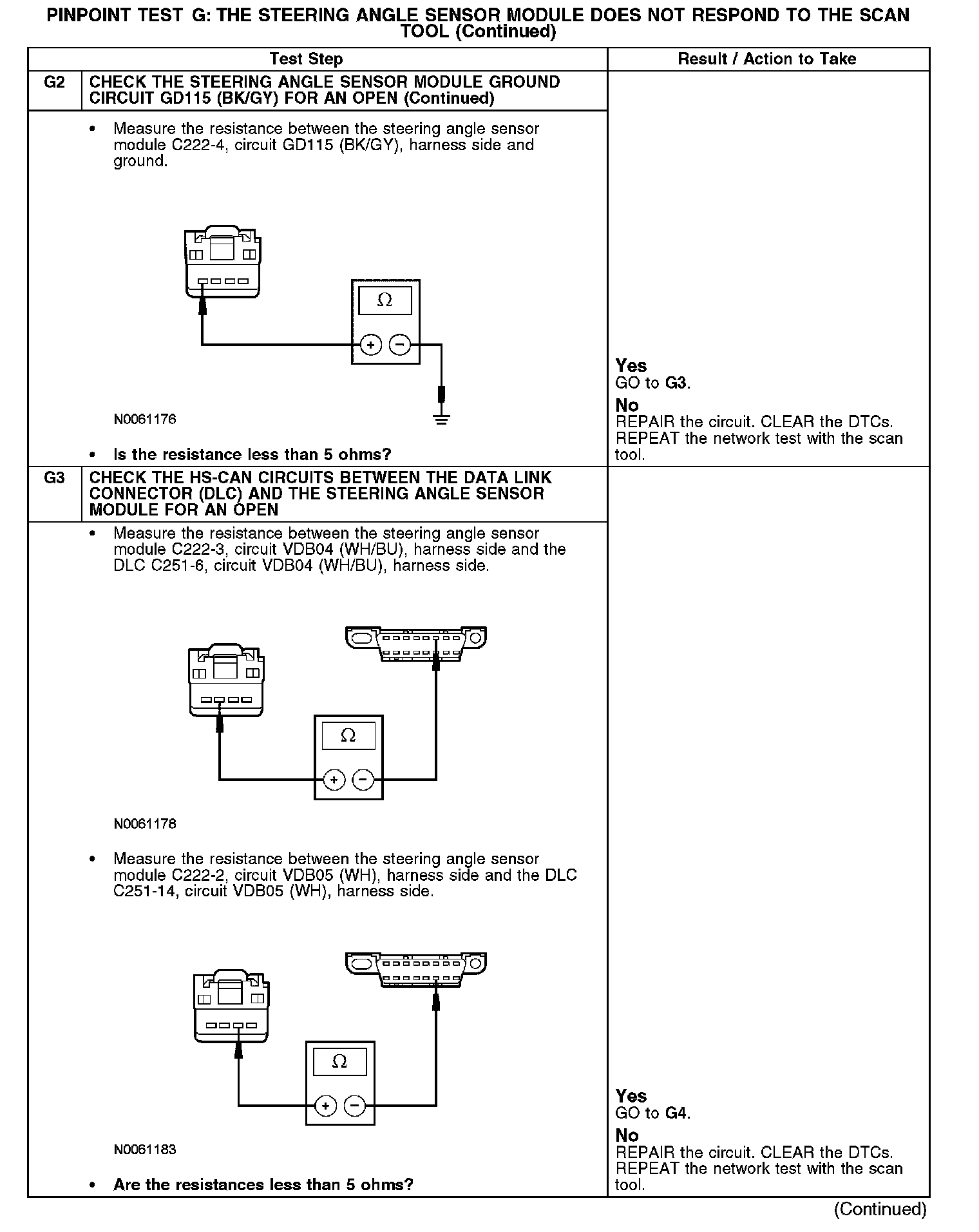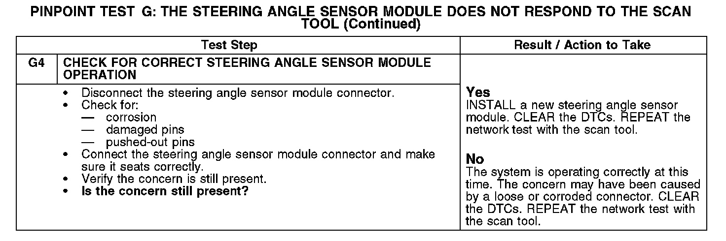 Home >> Ford >> 2007 >> Edge AWD V6-3.5L >> Repair and Diagnosis >> Powertrain Management >> Computers and Control Systems >> Information Bus >> Testing and Inspection >> Pinpoint Tests >> Test G: The Steering Angle Sensor Module Does Not Respond To The Scan Tool