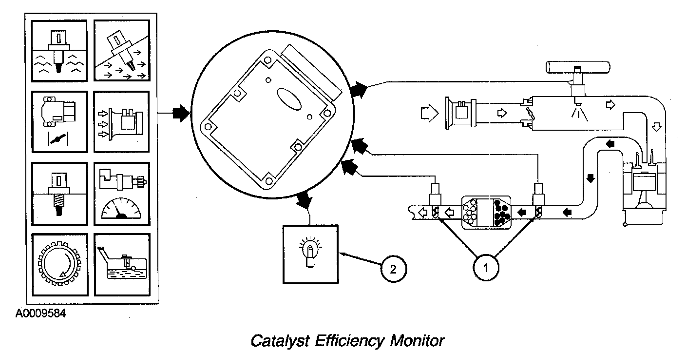 Inputs from engine coolant temperature (ECT) or cylinder head temperature (CHT), intake air temperature (IAT), mass air flow (MAF), crankshaft position (CKP), throttle position (TP), and vehicle speed sensors are required to enable the Catalyst Efficiency Monitor.