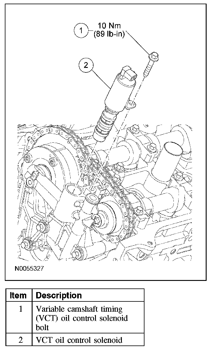 2. Remove the bolt and the variable camshaft timing (VCT) oil control solenoid.