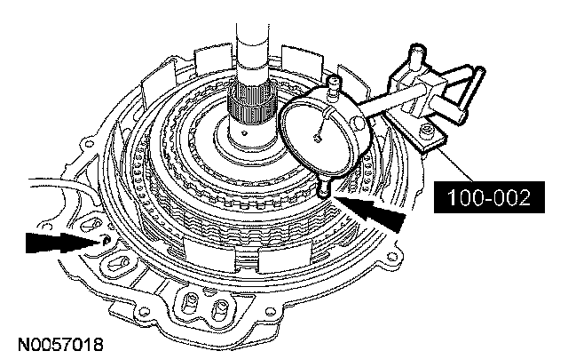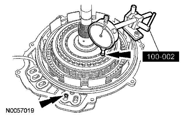27. Position the plunger on the direct clutch pressure plate. Apply 483 kPa (70 psi) of air pressure to the direct clutch piston port while recording the clutch pack clearance on the dial indicator. The clearance should be between 0.98 mm (0.03 inch) and 2.34 mm (0.08 inch). If the clearance is out of range, check the direct clutch pack for correct installation. If the direct clutch pack is correctly installed, install a new direct clutch pack.
