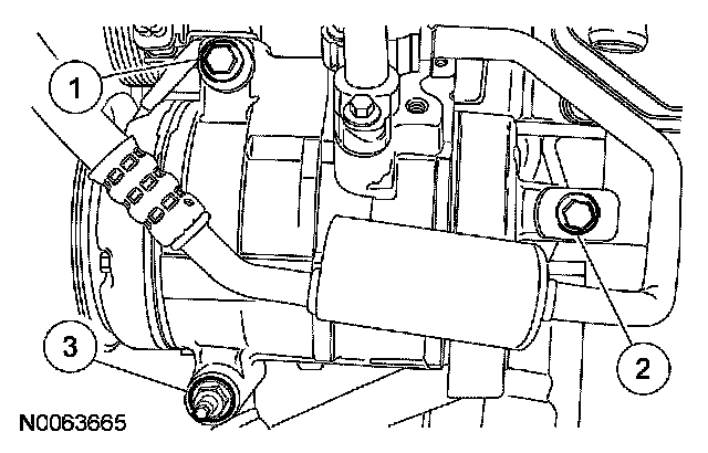 8. Tighten the A/C compressor bolts and nut in the sequence shown.
