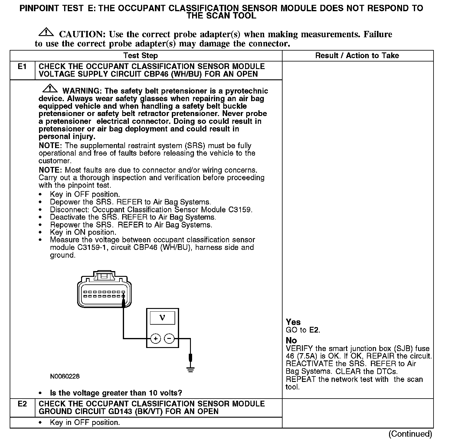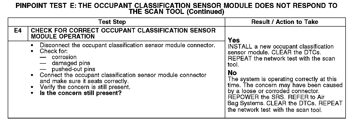 PINPOINT TEST E: THE OCCUPANT CLASSIFICATION SENSOR MODULE DOES NOT RESPOND TO THE SCAN TOOLE1-E2: