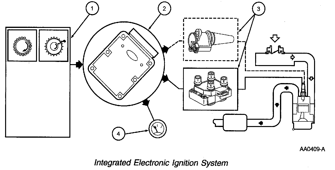 The integrated electronic ignition system consists of a crankshaft position (CKP) sensor, coil pack(s), connecting wiring, and a PCM. The coil-on-plug (COP) integrated electronic ignition system uses a separate coil per spark plug, and each coil is mounted directly onto the plug. The COP integrated electronic ignition system eliminates the need for spark plug wires, but does require input from the camshaft position (CMP) sensor. Operation of the components are as follows: