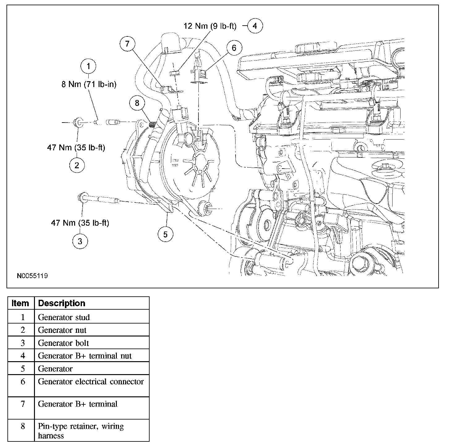 4. Position the generator protective cover aside, remove the nut and position the generator B+ terminal aside.