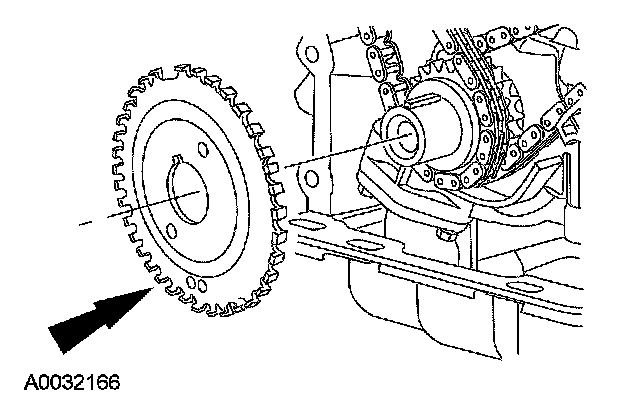 14. CAUTION: Damage to the variable camshaft timing (VCT) phaser sprocket assembly will occur if mishandled or used as a lifting or leveraging device.