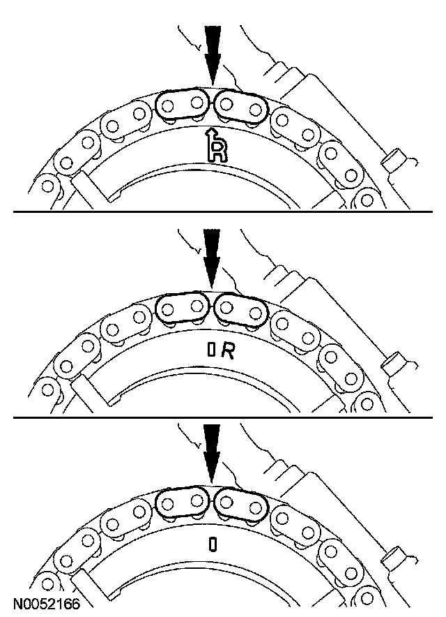 16. Position the lower end of the RH (outer) timing chain on the crankshaft sprocket, aligning the timing mark on the sprocket with the single copper (marked) chain link.