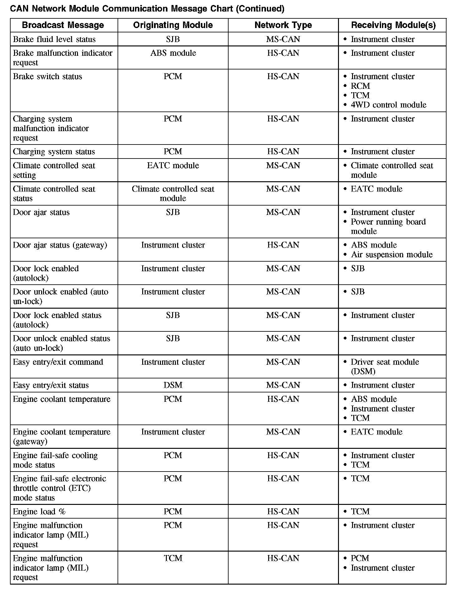 The chart describes the specific CAN network messages broadcast by each module, and the module(s) that receive the message: