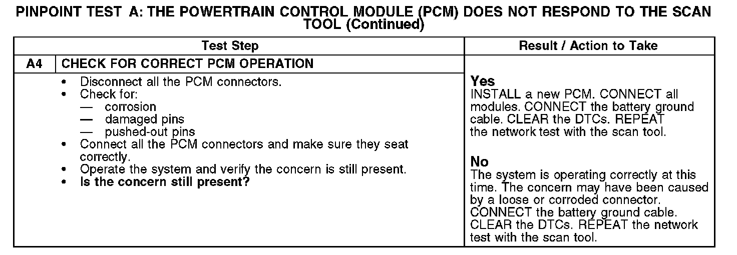 PINPOINT TEST A: THE POWERTRAIN CONTROL MODULE (PCM) DOES NOT RESPOND TO THE SCAN TOOLA1-A2: