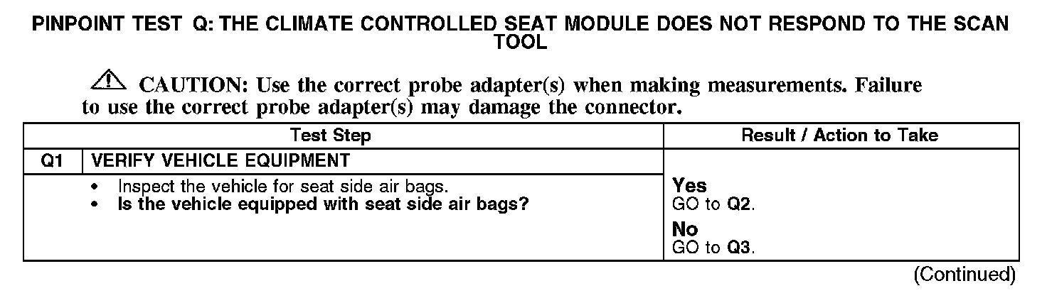 PINPOINT TEST Q: THE CLIMATE CONTROLLED SEAT MODULE DOES NOT RESPOND TO THE SCAN TOOLQ1: