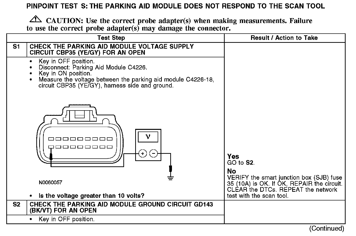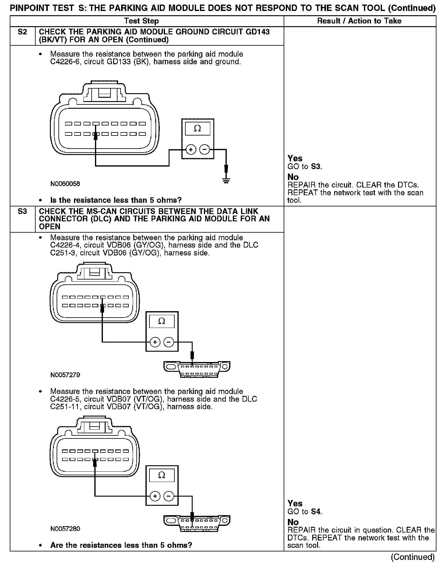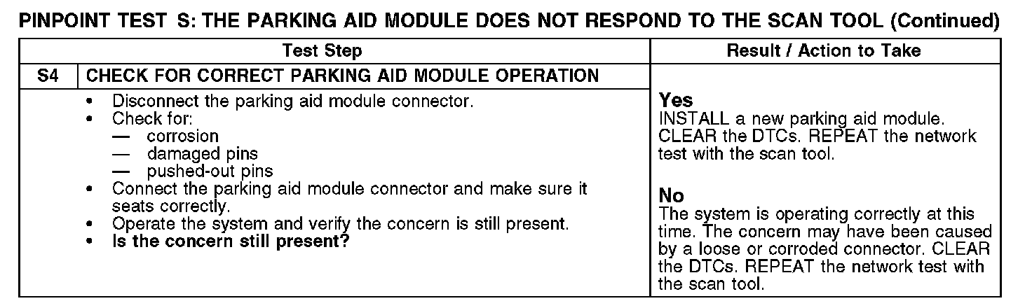 Home >> Ford >> 2007 >> Expedition 2WD V8-5.4L >> Repair and Diagnosis >> Powertrain Management >> Computers and Control Systems >> Information Bus >> Testing and Inspection >> Pinpoint Tests >> Test S: The Parking Aid Module Does Not Respond To The Scan Tool