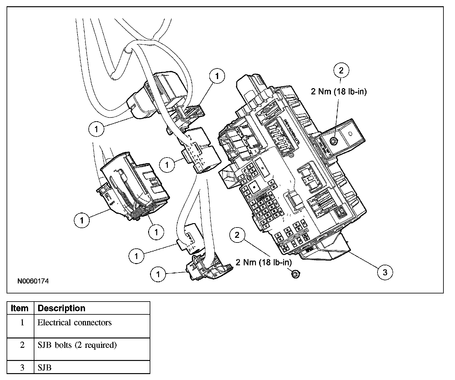 1. Position the SJB and install the 2 bolts.