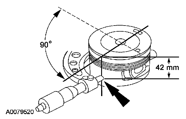 1. Measure the piston diameter 90 degrees from the piston pin and 42 mm down from the top of the piston at the point indicated.