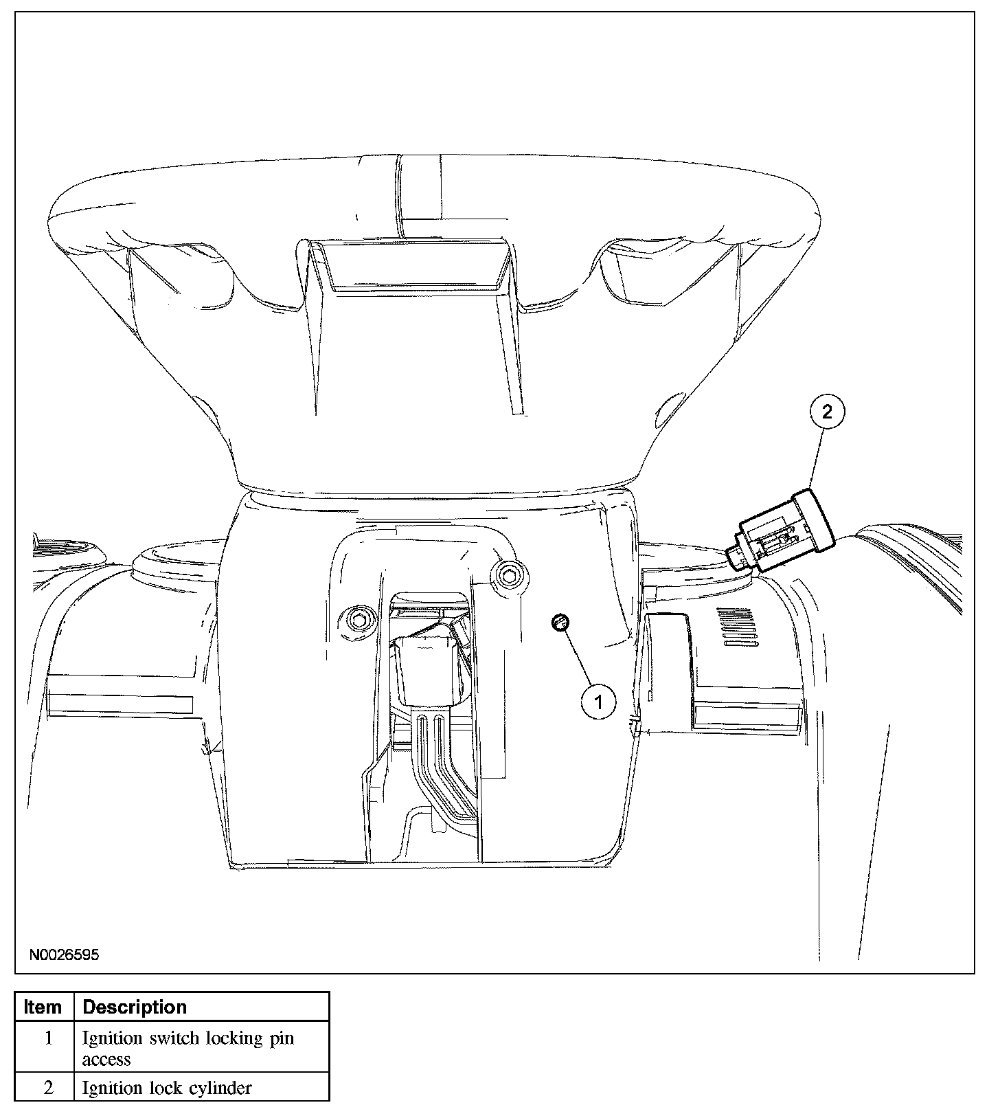 1. With the ignition switch in the ON position, press the locking pin with a suitable tool and remove the ignition lock cylinder.