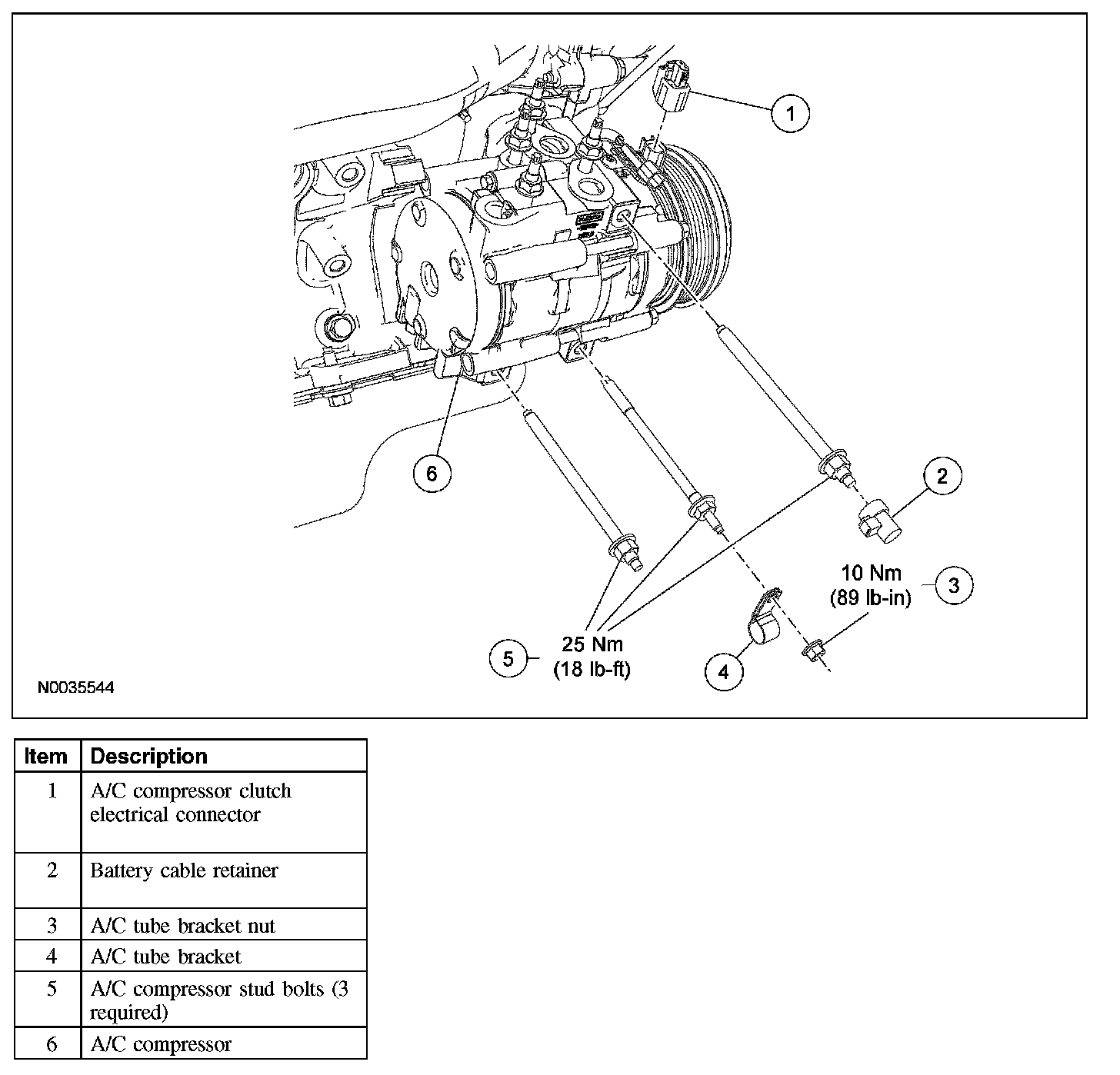 4. Detach the battery cable retainer from the A/C compressor stud bolts.