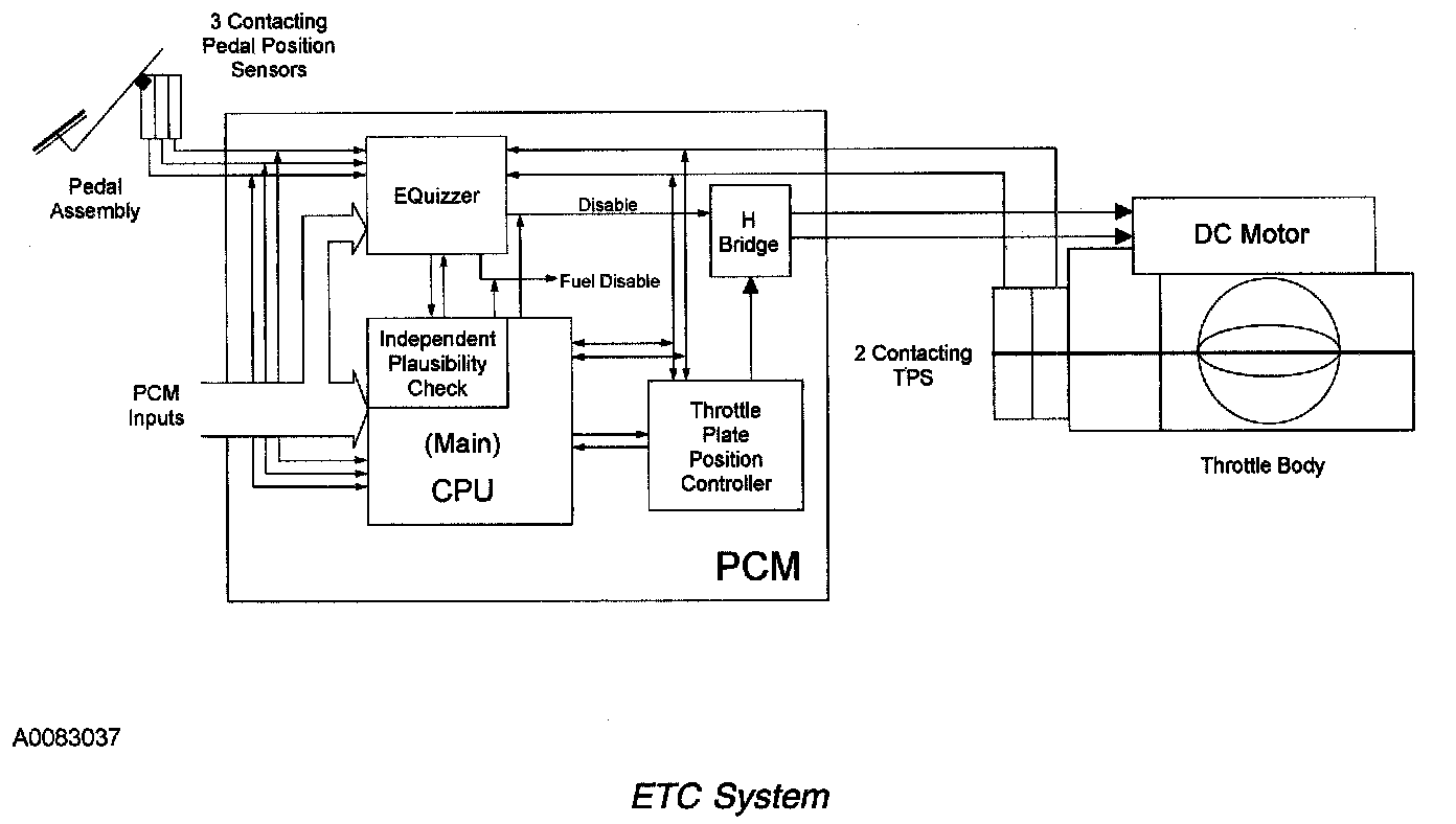 The ETC monitor system is distributed across 2 processors within the PCM: the main powertrain control processor unit (CPU) and a monitoring processor called an enhanced-quizzer (E-Quizzer) processor. The primary monitoring function is carried out by the independent plausibility check (IPC) software, which resides on the main processor. It is responsible for determining the driver-demanded torque and comparing it to an estimate of the actual torque delivered. If the generated torque exceeds driver demand by a specified amount, the IPC takes appropriate corrective action.