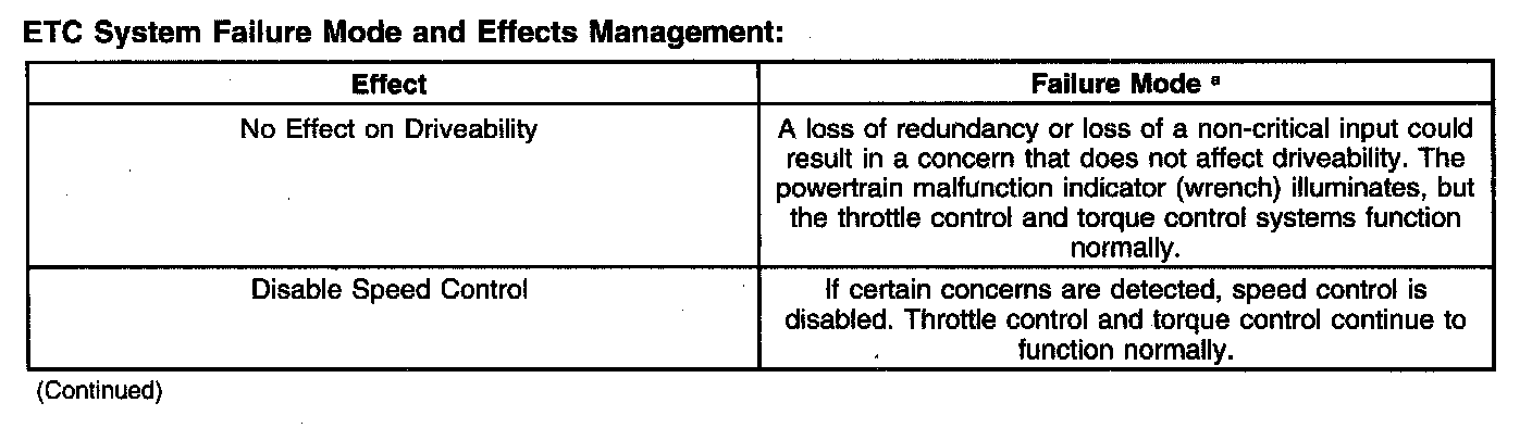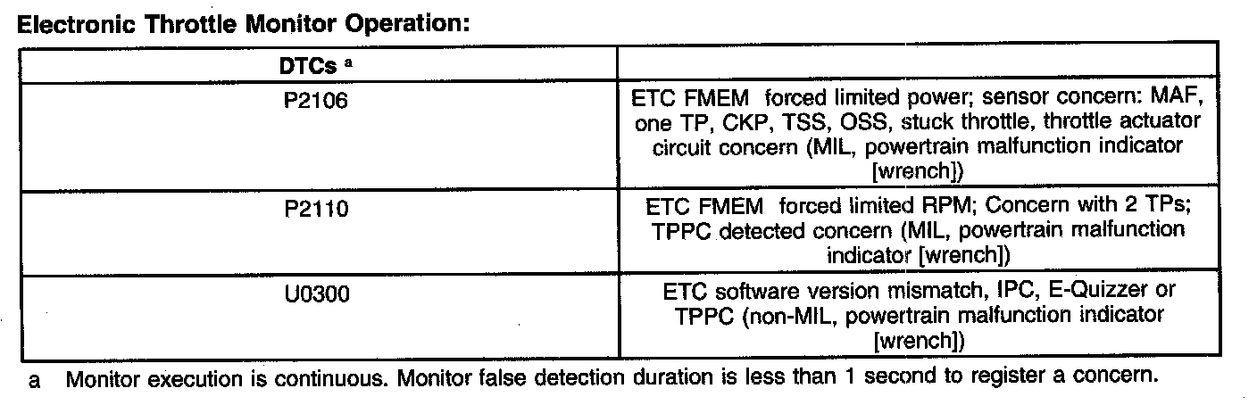 It should be noted that the ETC system illuminates a powertrain malfunction indicator (wrench) on the instrument cluster when a concern is present. Concerns are accompanied by diagnostic trouble codes (DTCs) and may also illuminate the malfunction indicator lamp (MIL).