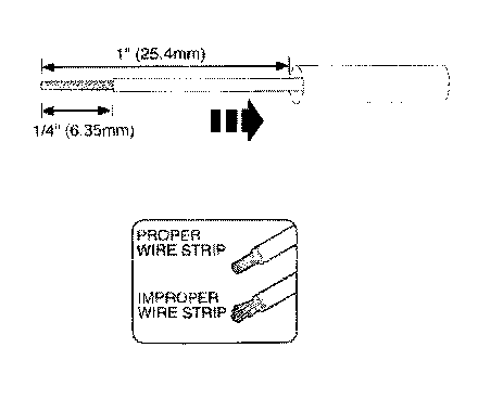2. Strip 1/4" (6.35mm) of insulation from each wire end, taking care not to nick or cut wire strands.