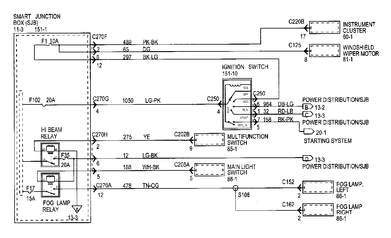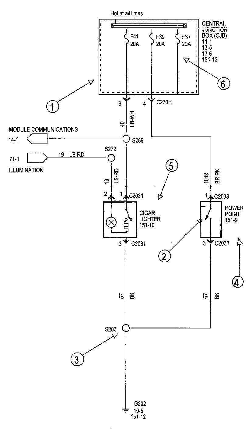 Each set normally starts with the component that powers the circuit, such as a fuse or the ignition switch. Current flow is shown from the power source at the top of the diagram to ground at the bottom of the diagram. A full representation of the power supply of a fuse or the power distribution from a fuse to various components is given in Power and Ground Distribution Diagrams. Full representation of the ground connections are shown in Power and Ground Distribution Diagrams.