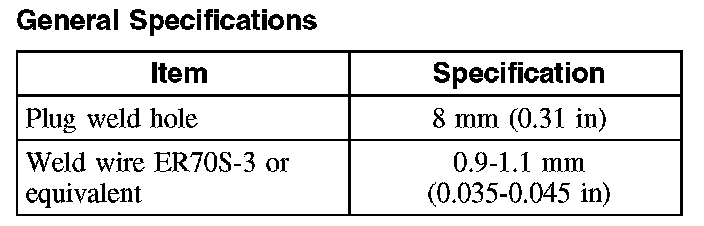 - Factory spot welds may be substituted with either STRW or MIG plug welds. Spot/plug welds should equal factory welds in both location and quantity. Do not place a new spot weld directly over an original weld location. Plug weld hole should equal 8 mm (0.31 in) diameter.