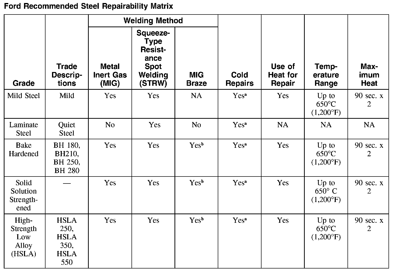 Ford Recommended Steel Repairability Matrix (Part 1):