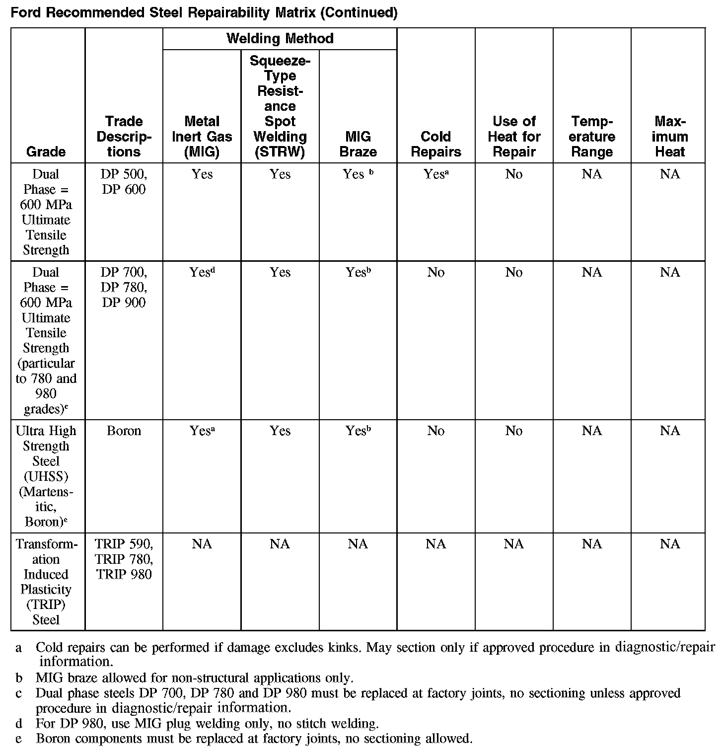 Ford Recommended Steel Repairability Matrix (Part 2):