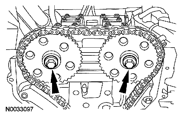 Using the flats on the camshafts to prevent camshaft rotation, tighten the sprocket bolts.