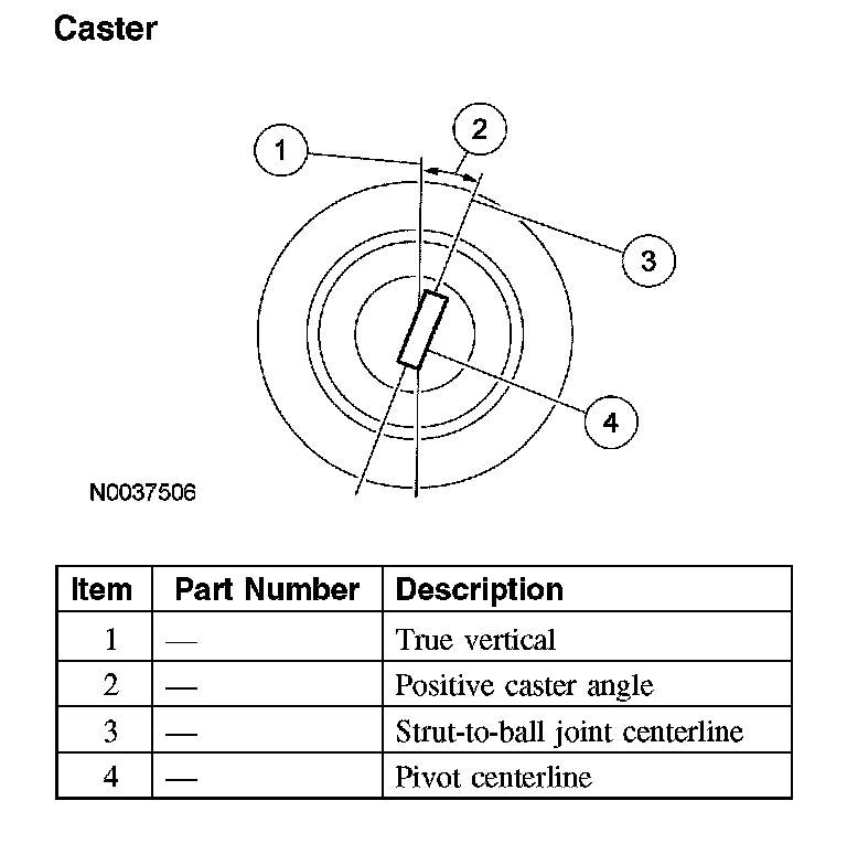 Caster is the deviation from vertical of an imaginary line drawn through the pivot points (top of strut and lower ball joint), when viewed from the side. The caster specifications will give the vehicle the best directional stability characteristics when loaded and driven. The caster setting is not related to tire wear.