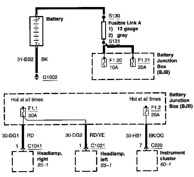 Each set normally starts with the component that powers the circuit, such as a fuse or the ignition switch. Current flow is shown from the power source at the top of the diagram to ground at the bottom of the diagram. In order to concentrate on the essential parts, power supply and ground connections are sometimes simplified by a dashed line in the diagrams. A full representation of the power supply of a fuse or the power distribution from a fuse to various components is given in Power and Ground Distribution Diagrams. Full representation of the ground connections are shown in Power and Distribution Diagrams.