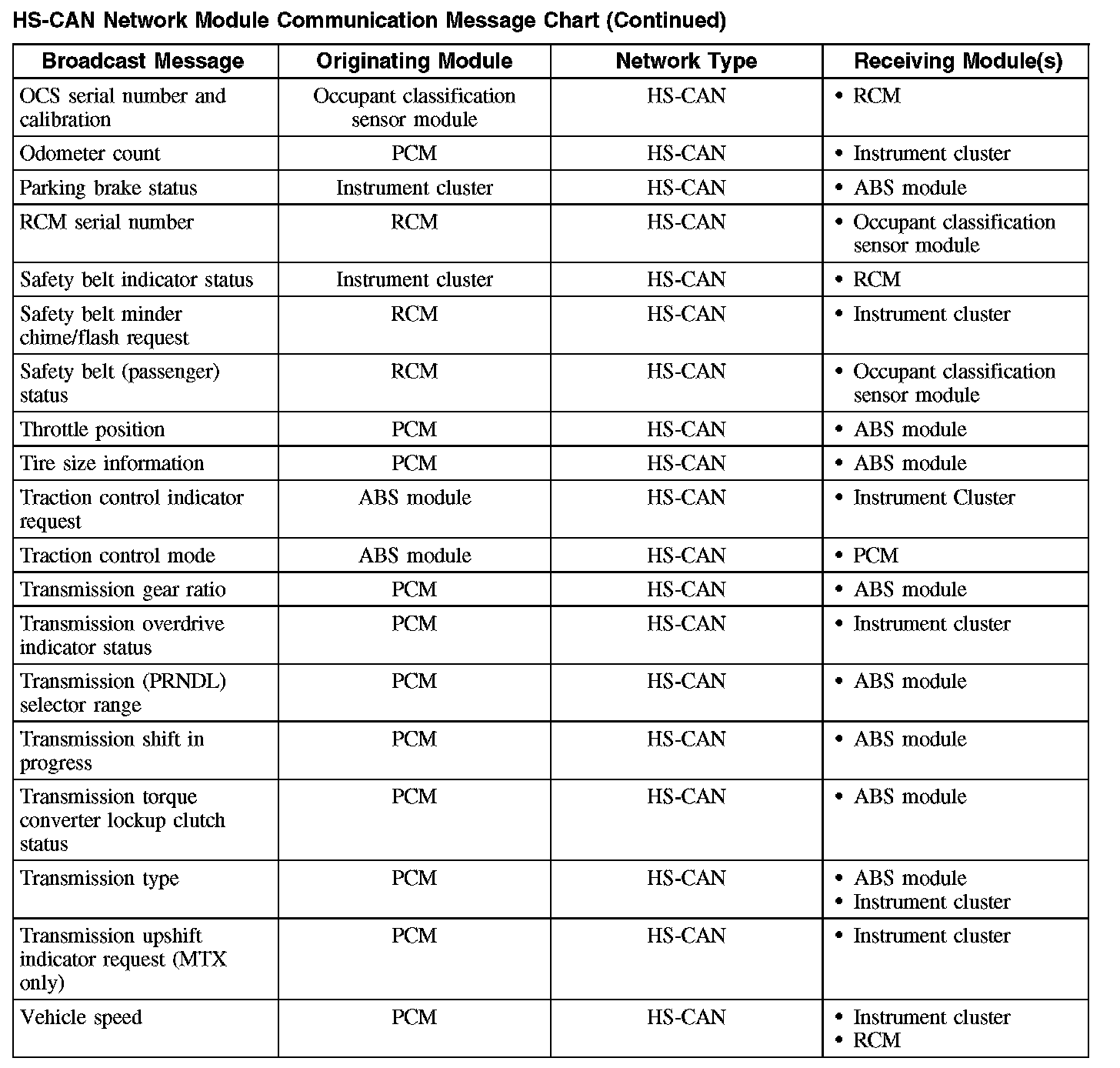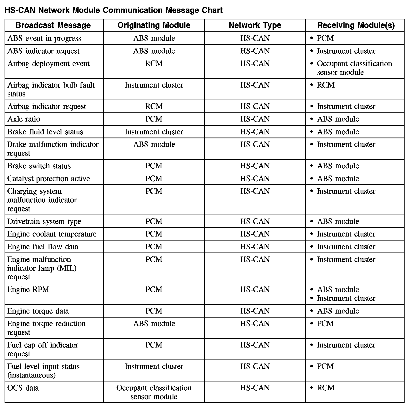 The chart describes the specific HS-CAN network messages broadcast by each module, and the module(s) that receive the message: