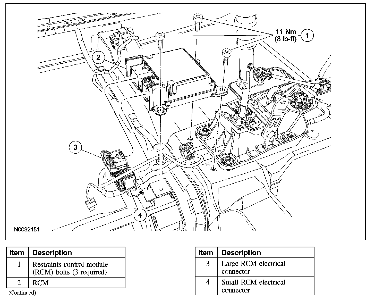 1. WARNING: The tightening torque of the air bag RCM retaining bolts is critical for correct system operation.