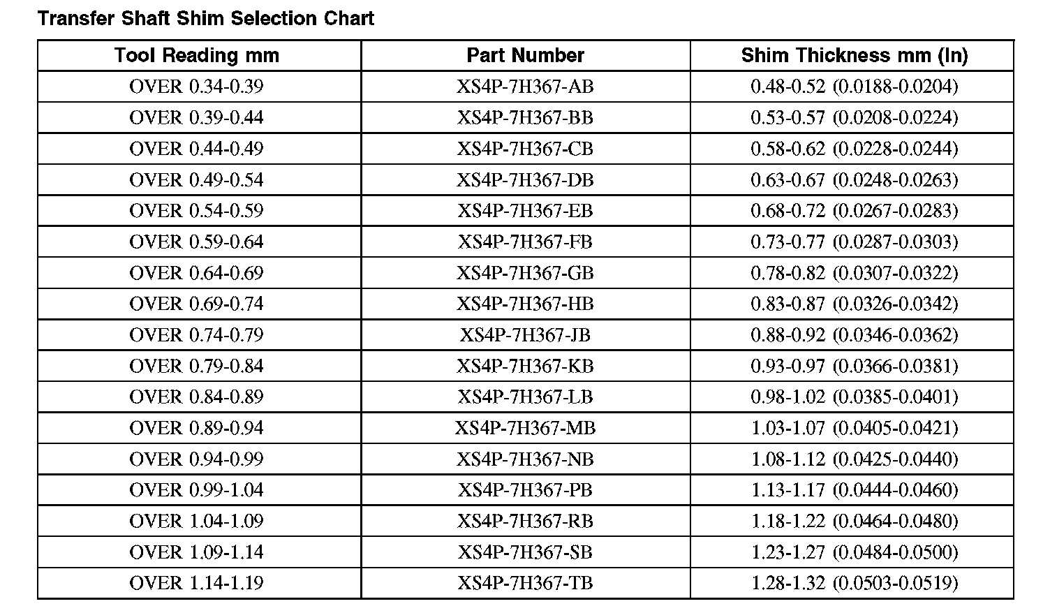 Transfer Shaft Shim Selection Chart
