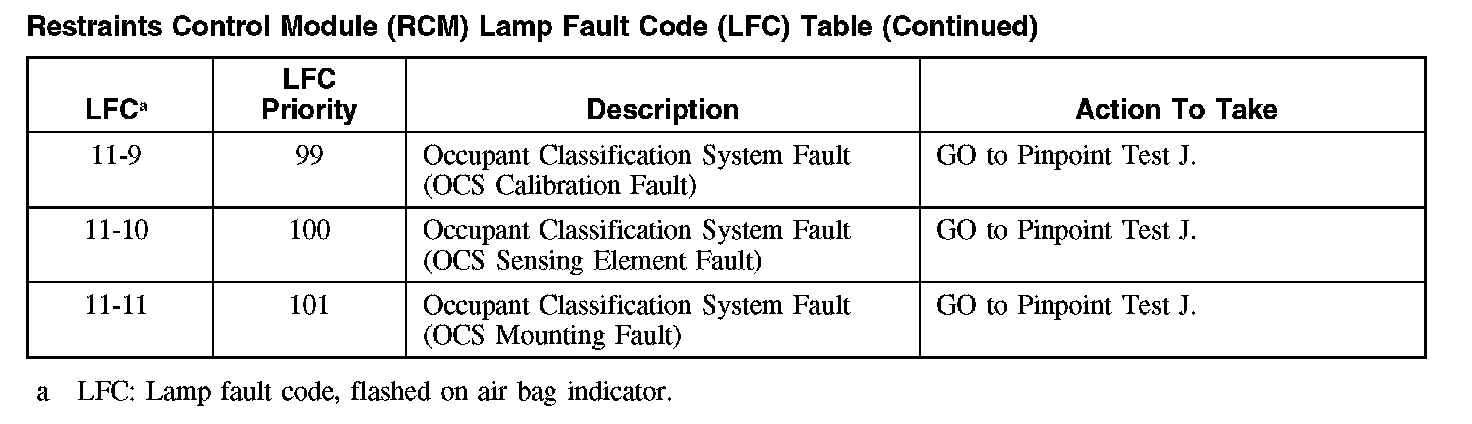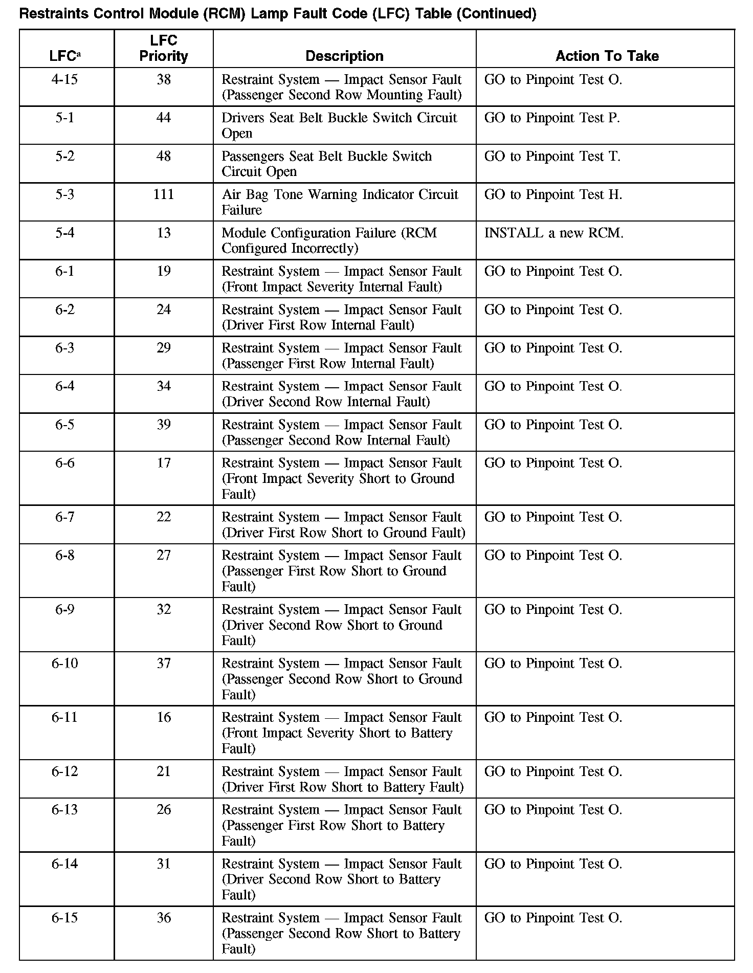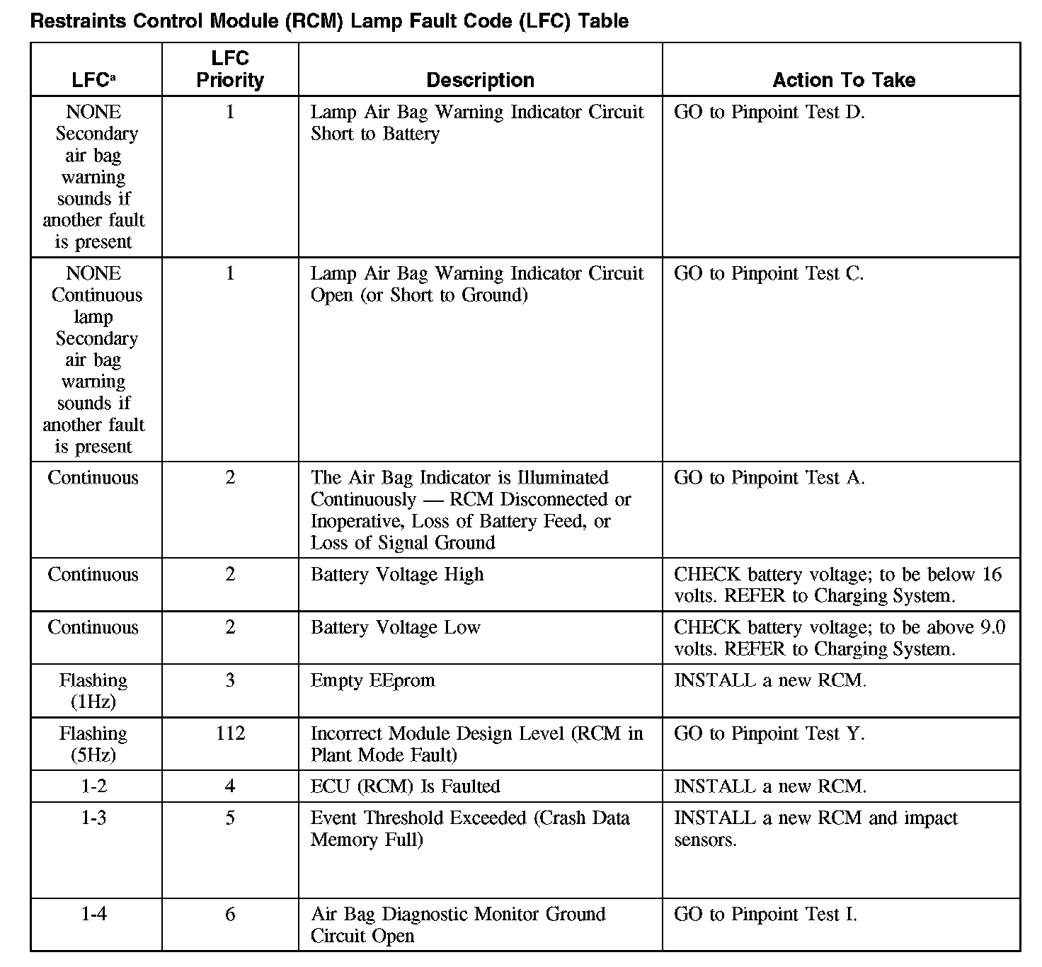 RESTRAINTS CONTROL MODULE (RCM) LAMP FAULT CODE (LFC) TABLERestraints Control Module (RCM) Lamp Fault Code (LFC) Table (Part 1):