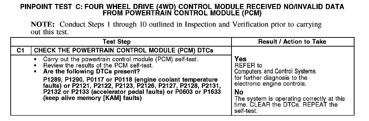 Test C: Four Wheel Drive (4WD) Control Module Received No/Invalid Data From Powertrain Control Module (PCM)