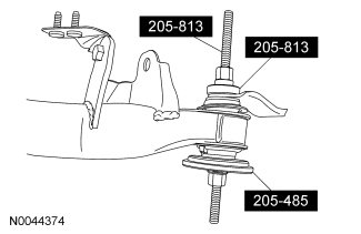 Assemble the special tools to the rear subframe with the new front bushings. The upper and lower bushings are installed at the same time.