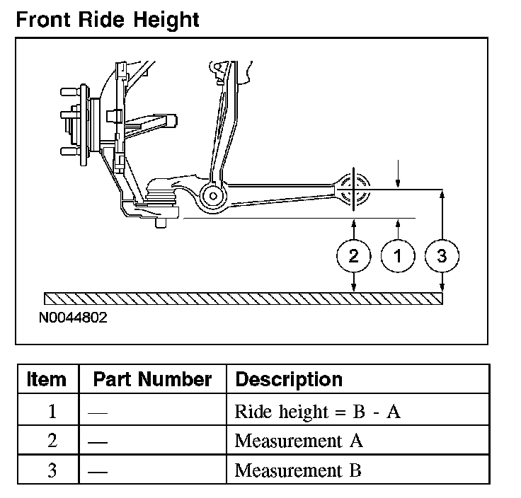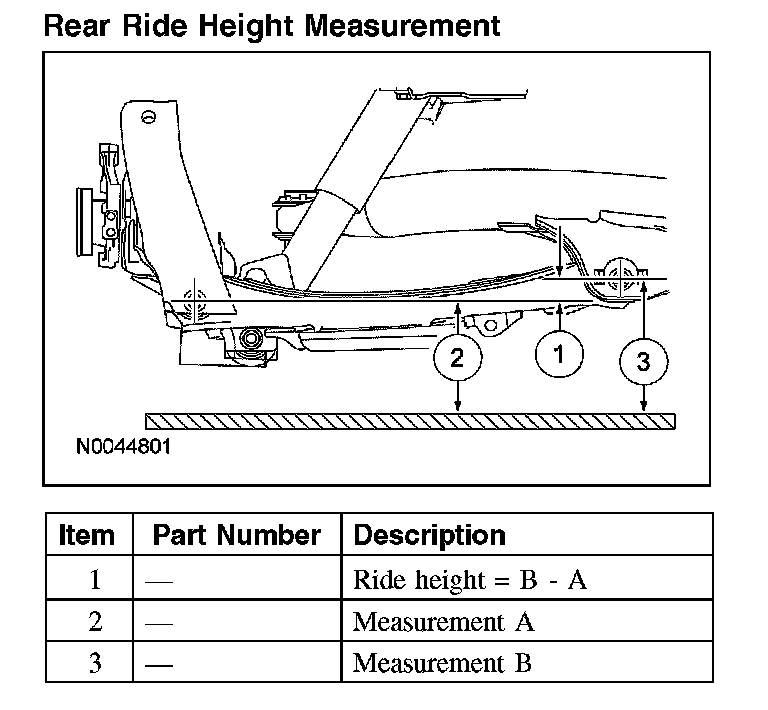 To measure ride height, the vehicle must be in a level, static ground position with full fluids and the fuel tank full. An empty fuel tank will increase the front ride height 1.5 mm (0.05 inch) and increase the rear ride height 9 mm (0.35 inch).