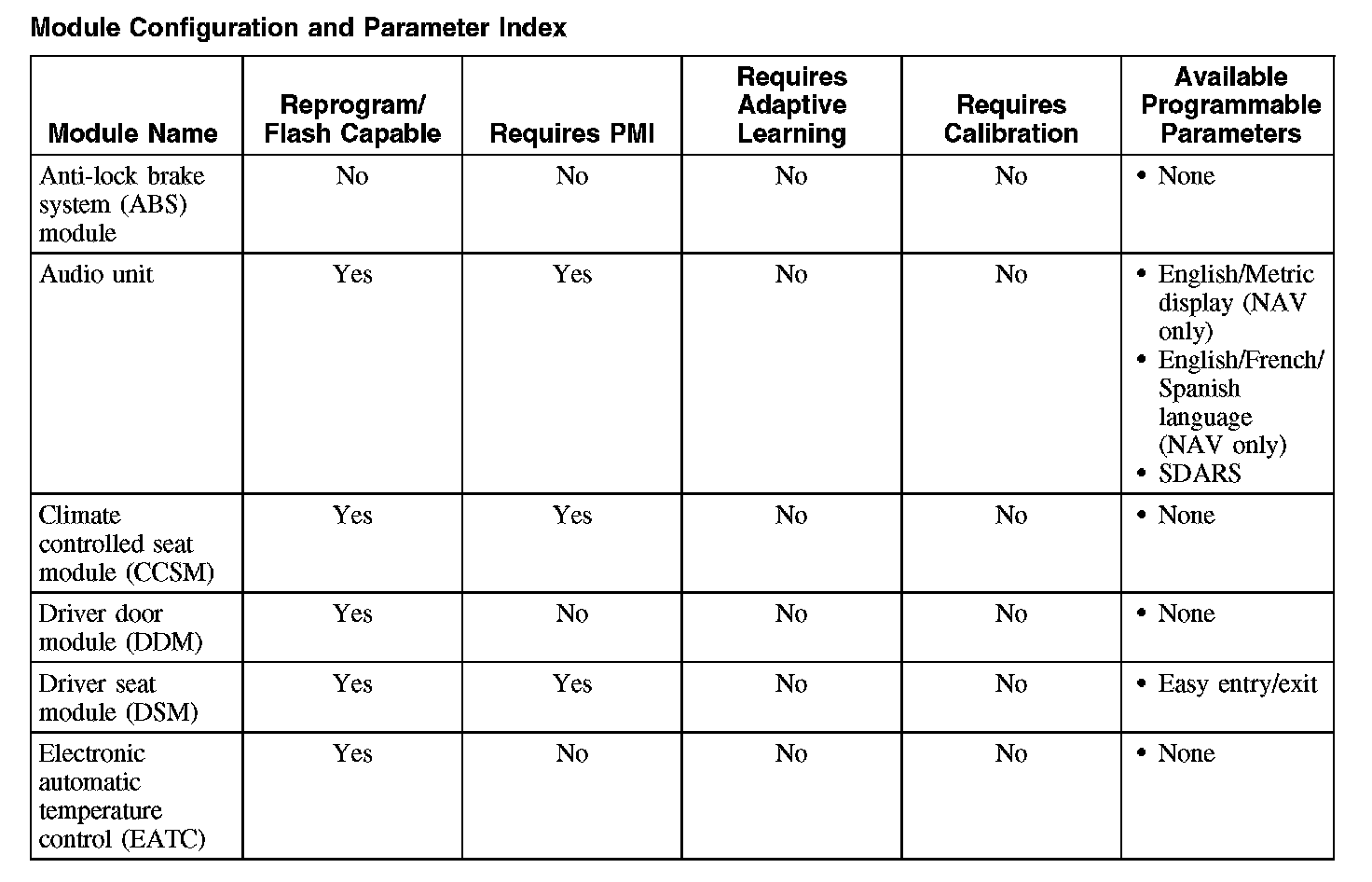 Programmable parameters are customer preference items that may be modified by the dealer via scan tool or in some cases modified by the customer following a procedure listed in the vehicle Owner's Literature. While many configuration options may exist for a module, only a few of these options are programmable parameters.