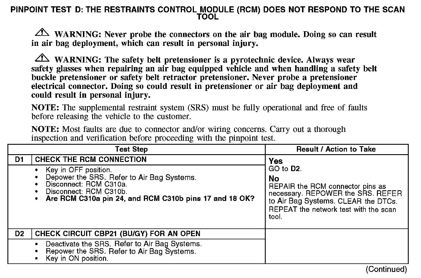 PINPOINT TEST D: THE RESTRAINTS CONTROL MODULE (RCM) DOES NOT RESPOND TO THE SCAN TOOL