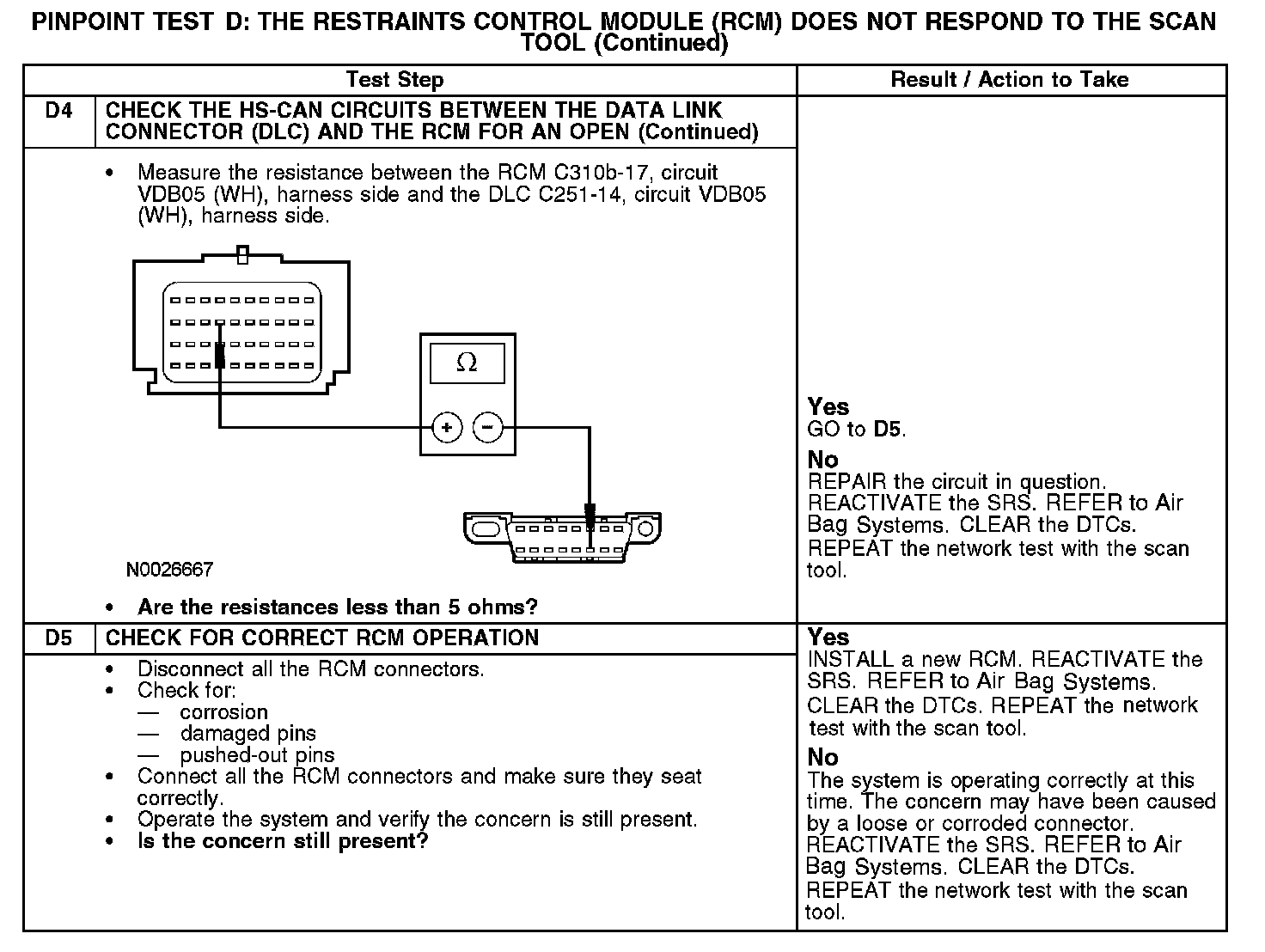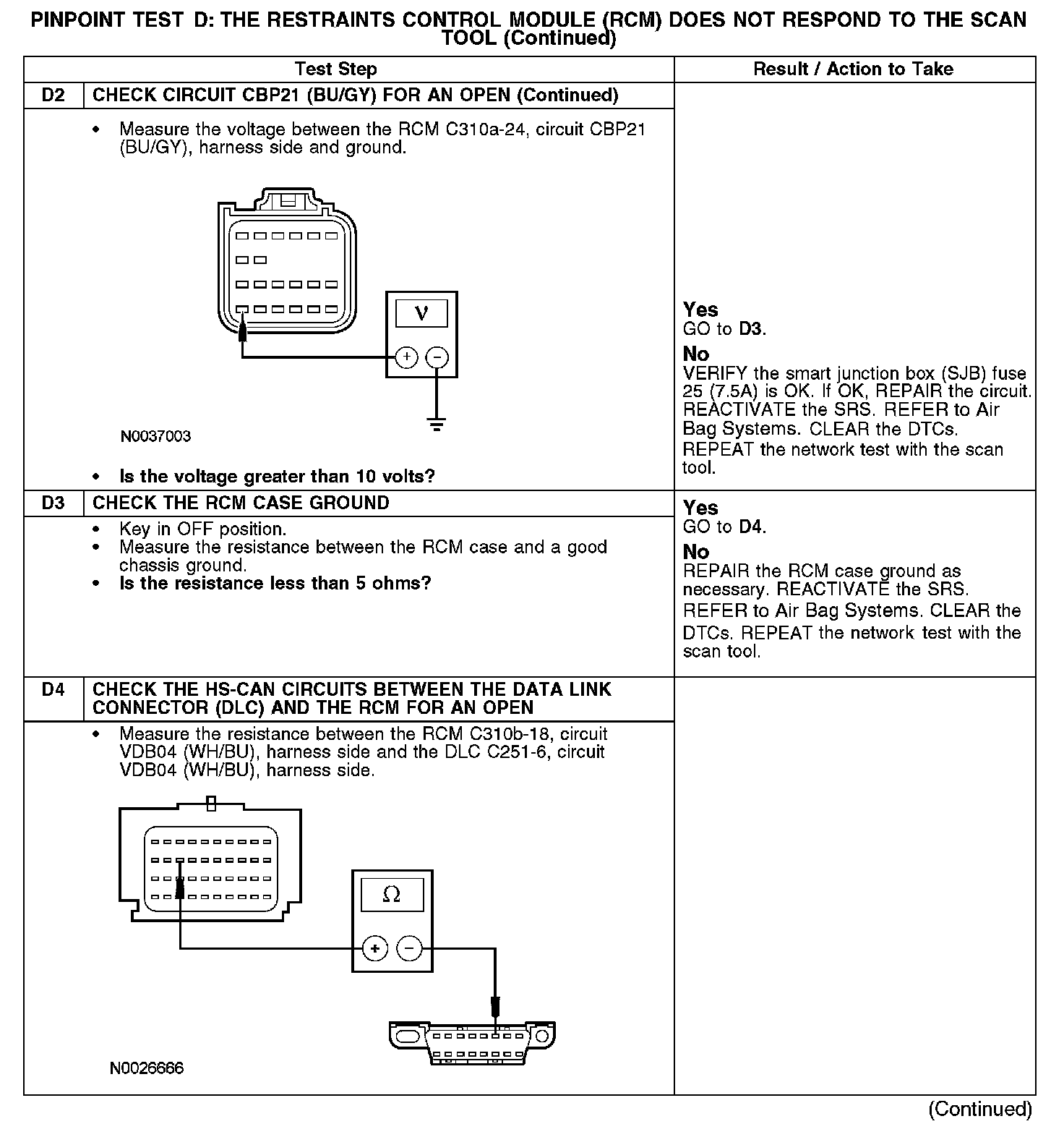 Home >> Ford >> 2007 >> Fusion FWD L4-2.3L VIN Z >> Repair and Diagnosis >> Powertrain Management >> Computers and Control Systems >> Information Bus >> Testing and Inspection >> Pinpoint Tests >> Test D: The Restraints Control Module (RCM) Does Not Respond To The Scan Tool