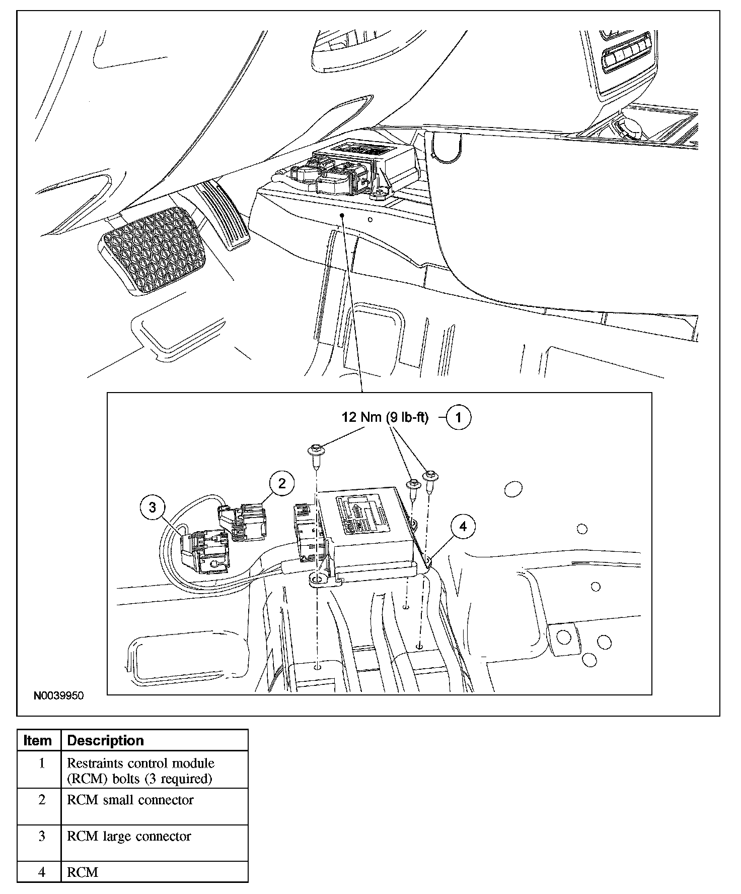 1. WARNING: The tightening torque of the air bag RCM retaining bolts is critical for correct system operation.