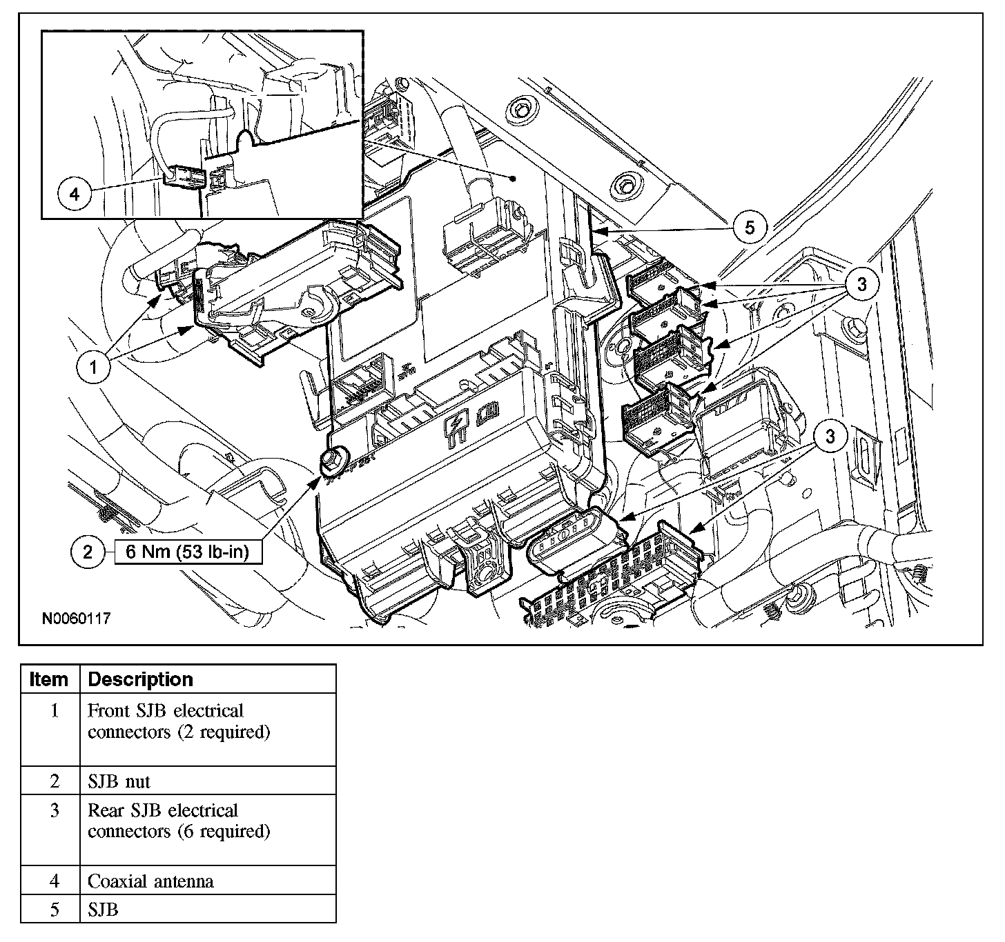 Disconnect the 6 rear SJB electrical connectors, the coaxial antenna and remove the SJB.