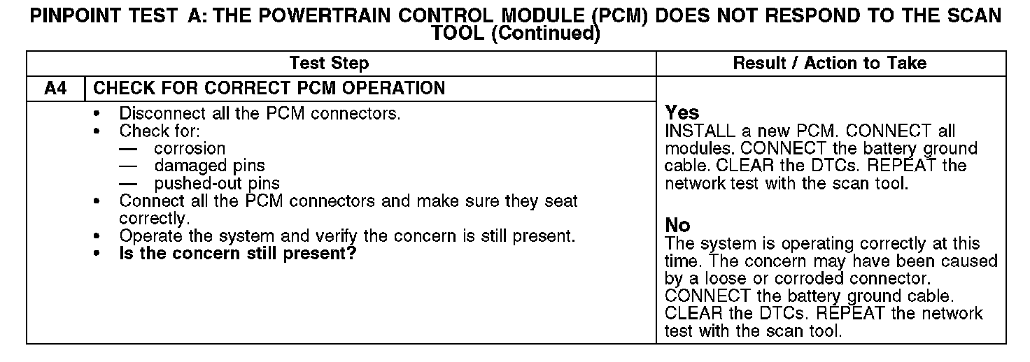 PINPOINT TEST A: THE POWERTRAIN CONTROL MODULE (PCM) DOES NOT RESPOND TO THE SCAN TOOLA1-A2: