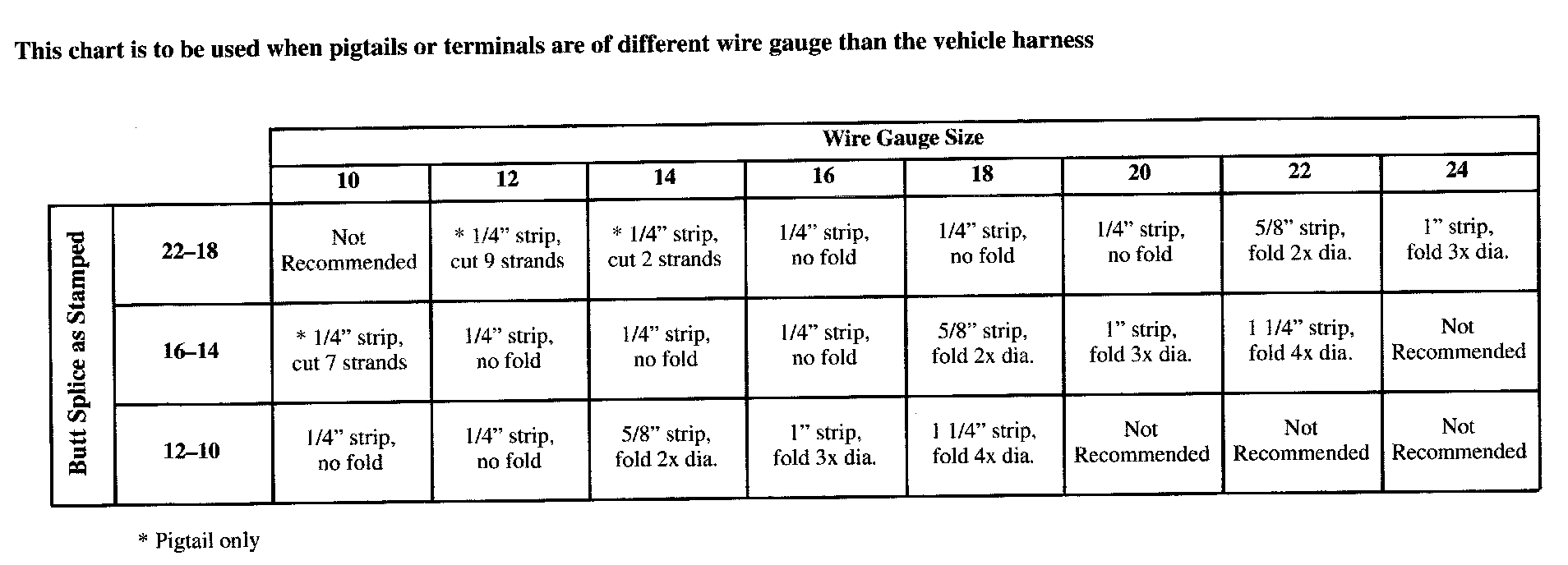 The given chart is to be used when pigtails or terminals are different wire gauge than the vehicle harness.