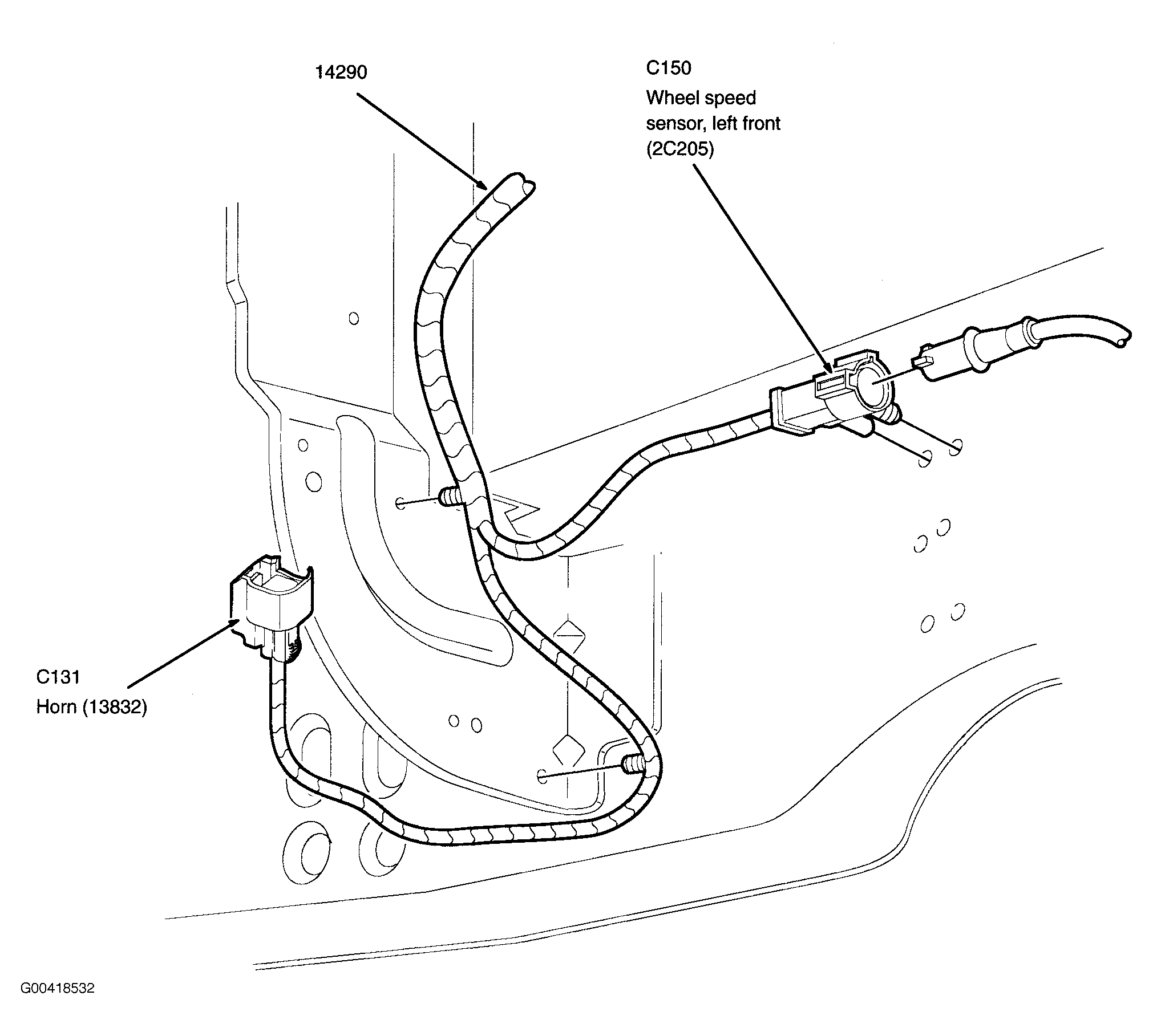 | Horn | Lower left front of engine compartment. See Figure. |