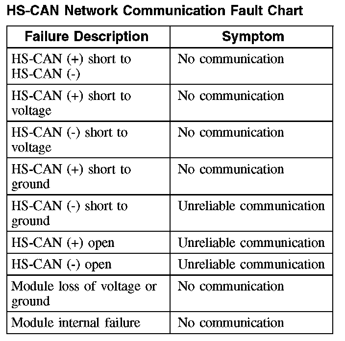 The fault chart describes the specific HS-CAN network failures and their resulting symptom.